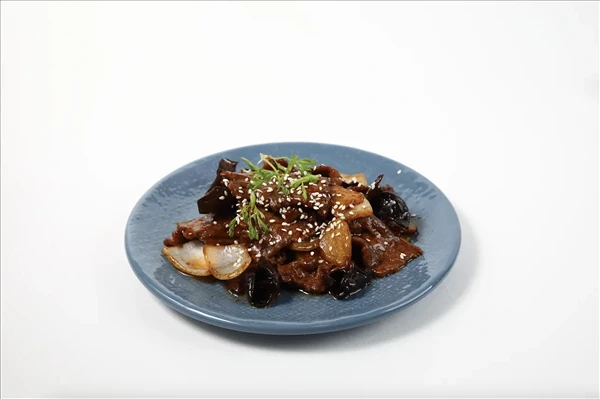Говядина, лук репчатый, болгарский перец, кунжутные семечки